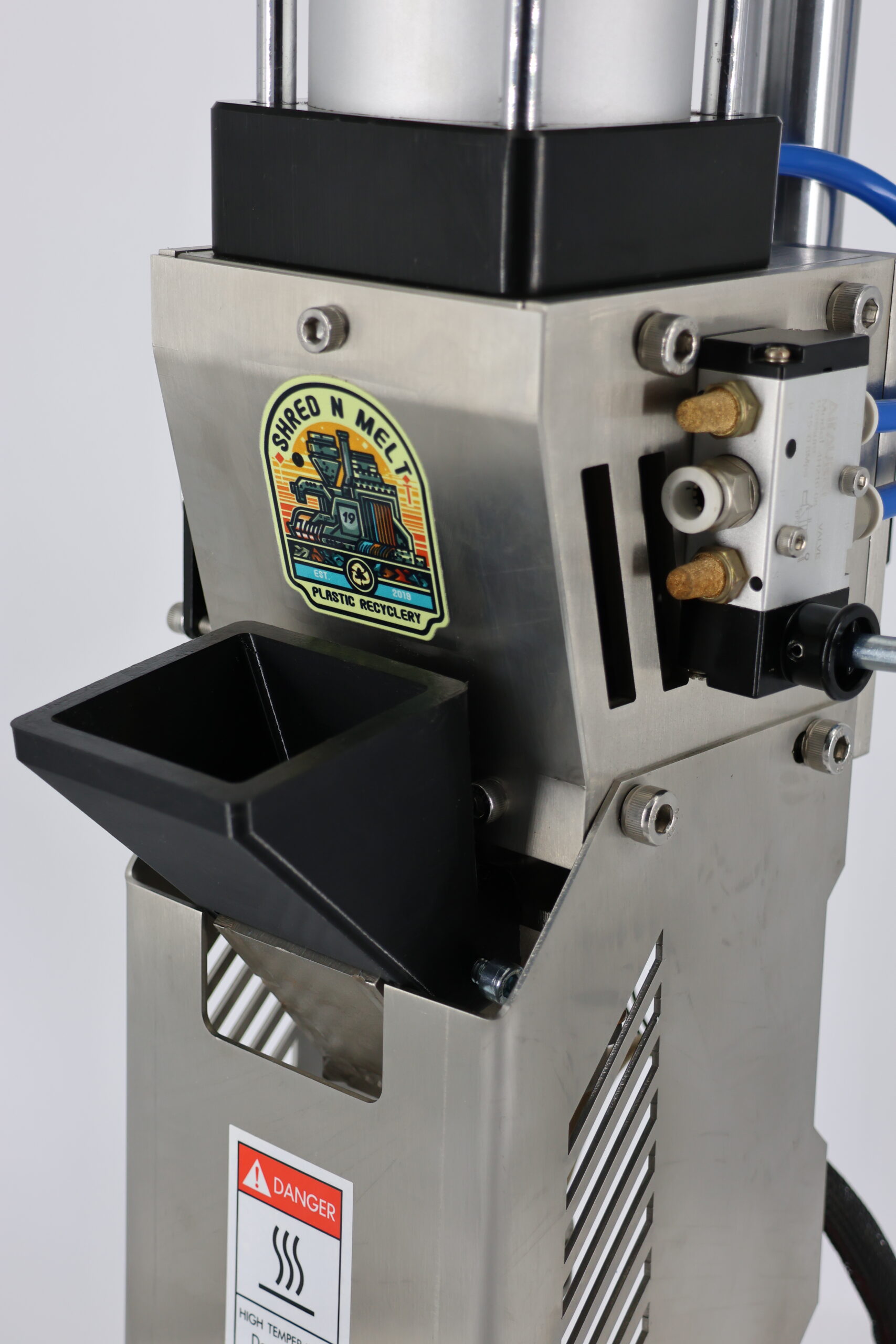 Desktop pneumatically operated injection moulder, great for small batch producti0on runs for recycling small plastics in the workplaces, home business or educational environment.